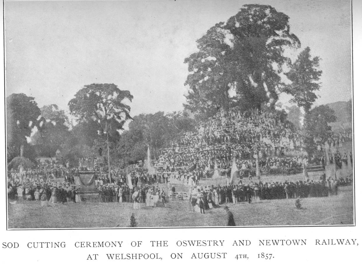 p. 22“Soon after four o’clock Llanidloes Station was reached, and the passengers alighted amidst the shouts of the inhabitants, who had come to welcome them. A large circle was formed in the field adjoining the Station, and Mr. Whalley introduced to those assembled Mrs. Owen, of Glansevern, who declared the line to be opened.”