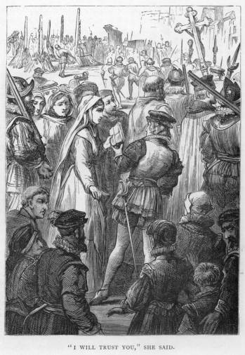 “If I had you here, I should not so much mind,” she said; “but to let you go forth into that land where the cruel Duke practises his barbarities, and may perchance seize you and cast you into prison, I cannot bear to think of it!” and again she burst into tears.
