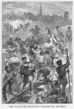 Master Gresham ordered his attendants to try and force their way out of the crowd. At length, many persons, unwilling to witness the suffering of the victims, retired along the various streets leading into the Mere, thus giving an opportunity to the English party to retreat. Once more the young boy cast a terrified glance towards the horrible spectacle, when the groom, in mercy, throwing a cloak round his head, pushed on through the crowd, the whole party making their way as rapidly as they could towards the royal merchant’s residence.