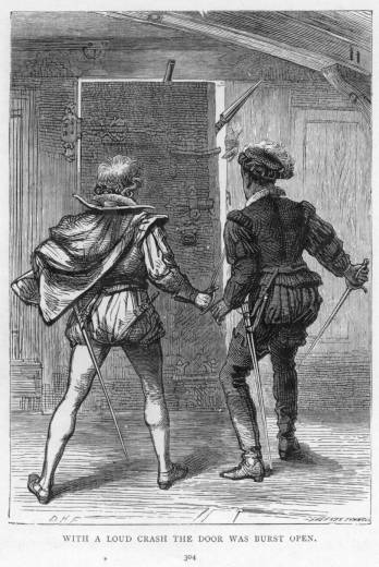 The musicians at intervals played for the amusement of the guests, and toward the end, lest they might have become weary of too many sweet sounds, the doors of the hall opened, and a band of maskers entered habited in various grotesque costumes. With a deep obeisance to the master of the feast, as well as to the lady and their visitors, the leader of the party commenced an oration the subject of which Ernst Verner was too young at the time to note down, and has long since forgotten. It was followed by the representation of a Morality, the subject of which also, for the same reason, is not noted in this diary. Ernst, with his young companion, little Richard Gresham, were running about the hall hand in hand, watching the maskers, and amusing themselves by observing the guests. One of the former, wearing a huge cloak which completely concealed his form, during the performance separated himself from his companions. His eye was fixed on the two boys. It might have been that he supposed no one observed him; but, even though attending to her guests, the mother’s glance was following her young Richard. With cautious steps the masker slowly moved up towards where the little boys were standing, their attention occupied with one of the most exciting portions of the mystery. At length the masker stood close to the boys. And now the eyes of every one in the hall were riveted on the performers. On a sudden, the cloak was thrown round the boys. No cry was heard, and the masker glided rapidly towards the door of the hall, still left open. So quick were his movements, that he would have escaped unobserved had not Lady Anne’s voice been heard, exclaiming, “Stop him! Stop him! He has carried off the children!” Richard Clough started from his seat, and drawing his dagger, rushed after the abductor. The man, turning his head at the cry, saw that he was pursued, and letting go one of the children—it was the little Richard—fled more rapidly. Honest Master Clough, however, with the excited feelings of a warm-hearted Welshman, pursued him. The man had just reached the door, when Master Clough caught him by the cloak, and would have struck his dagger into his neck, had he not loosened the garment and let go the little Ernst, whose head had been so muffled in a cloth that he had been unable to cry out. The man sprang from the door before Master Clough could again seize him, exhibiting, now deprived of his cloak, the dark dress of an ecclesiastic, though his head, still concealed by his large mask, prevented his features being visible. A number of persons were at the time passing, and the stranger was thus able to make his escape. Indeed, honest Master Clough, having gained his object of rescuing the children, probably considered that it might be wise not to continue the pursuit in the open street, where perchance he might have found more enemies than friends.