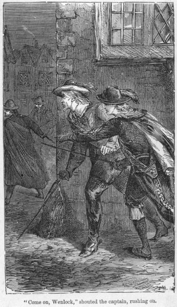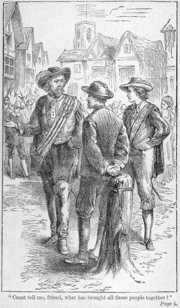 “You cannot go in there,” said the sergeant of the party; “we hold it in the name of the king. Begone about your business, or beware of the consequences!” In vain the grave citizens mildly expostulated. They received similar rough answers. By this time other persons had arrived, while many passers-by stopped to see what was going forward. Among those who came up was a tall young man, whose flowing locks and feathered cap, with richly-laced coat, and silk sash over his shoulder, to which, however, the usual appendage, a sword, was wanting, showed that he was a person of quality and fashion. Yet his countenance wore a grave aspect, which assumed a stern expression as he gazed at the soldiers. He stopped, and spoke to several of those standing round, inquiring apparently what had occurred. About the same time, another man, who seemed to be acquainted with many of the persons in the crowd, was making his way among them. He was considerably more advanced in life than the first-mentioned person, and in figure somewhat shorter and more strongly built.