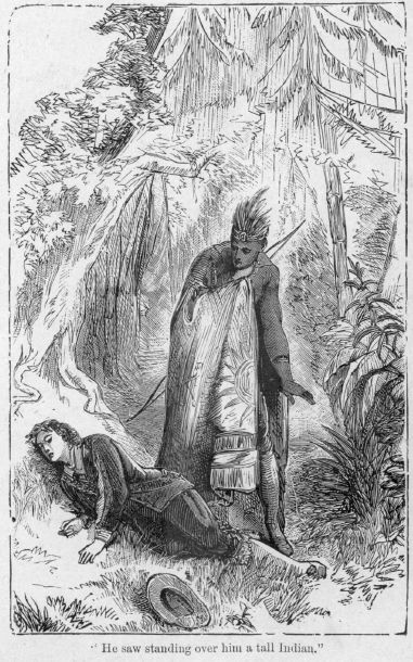 down to rest. His provisions, however, ran somewhat short; indeed, he had miscalculated the amount he should require. At length the fifth day came: his food was expended, and he had to confess that he had entirely lost his path. The whole day he wandered on, endeavouring to regain it. At last he got into what appeared an Indian path. He followed it up, but in the end found that it only led to a spot where an encampment had once stood—now deserted. He had been suffering greatly from thirst, even more than from hunger. To stay still might seal his fate. Onward, therefore, he pushed. At length, however, from want of food and water, his strength failed him. His sight grew dim, and, fainting, he fell on the ground. How long he had lain there he knew not, when he heard a strange, deep-toned, sonorous voice. Languidly he opened his eyes, and saw standing over him a tall Indian, of dignified appearance and full costume of paint and feathers.