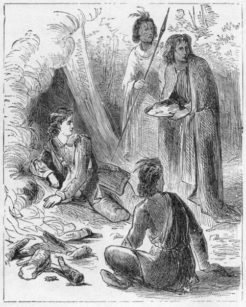 “Now, come; I will take you with me,” said Taminent, in more perfect English than Wenlock had expected to hear; and, supporting him in his arms, the chief led him along a path into which they quickly entered. After going some distance, an open space amid the trees appeared, and within it a collection of tall birch-bark wigwams of a conical shape. A number of women were seated in front of the huts, while children were playing about. On one side, the ground had been turned up, evidently for the reception of Indian corn or other seed, while stretched between poles were the skins of animals, the bodies of others being hung up over fires to dry in the smoke. As soon as the chief was seen, the women rose from their seats, and a number of men came out of the tents to welcome him. He introduced Wenlock in a few words, which the latter did not understand.