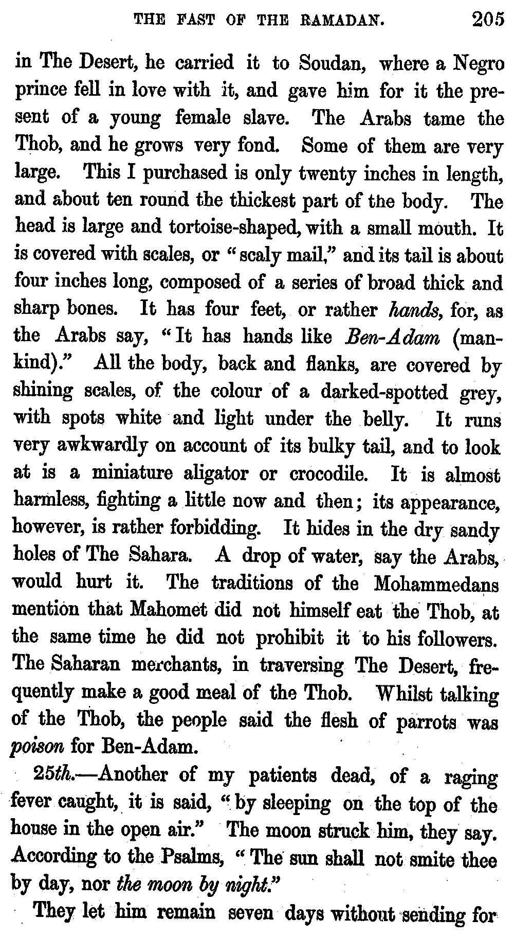1st April.—Rose early and started early. A terrible[436] day! A ghiblee in all its force[56]. The wind is directly from south (‮قبلي‬ "south"). It is quite dry, unlike the sirocco which blows at Malta. Sirocco is damp and most enervating, and south-east in its direction. Probably, however, it is the same wind, but sweeping over the sea it attracts moisture, and changes to south-east. I was praying for, and prophesying all the morning, up to 9 a.m., a cool day. The reverse has happened, as so often happens in answer to our most ardent wishes. I never was so astonished as when I saw the negroes on this day. Mr. Gagliuffi had said to me, "If you have[437] ghiblee, the slaves can't go." But I could hardly believe a hot wind to be so injurious to these children of the sun. They seemed as if they could bear any cold better than a hot south wind. They got behind the camels or stooped under their bellies; they held up their barracans, taking it by turns to hold them up, by which means they sheltered five or six together; they concealed their faces and their bodies with their tattered garments; they invented all sorts of expedients to shelter themselves a moment against The Desert simoum. I could not help observing how superior the white man was to the black man in his physical make. Our Arabs and Moors kept up erect, facing this furnace blast, and bore the heat[438] and burthen of the day a thousand times better than the Negroes—these children begotten by the sun from the slime of the Niger, on whose swampy plains heat reigns eternally with all its fiery fervour! I had always thought the Negro, being naturally a chilly creature, could not be affected with a hot wind. We all drank plentifully today, ten times as much as on other days. But this being a ghiblee day, it was necessary to drive on the slaves quick, and with violence, the camels not carrying a sufficiency of water for a couple of days of this sort. Essnousee now showed how eminently qualified he was for this infernal traffic. He did drive them on most furiously, while as to one wretched Negress, I thought he would have left her dead on the spot, flaying her most unmercifully. The miscreant Essnousee was only prevented from the perpetration of this horrid crime by the main-force interference of Mohammed Azou, another slave-dealer travelling with us, with seven slaves, and who, I must record, was a humane man, though a dealer in the flesh and blood of his fellow creatures. I have not observed him even once beating his slaves, which is saying a great deal. The conduct of this humane Moor proved that it was not absolutely necessary to beat slaves when driving them over Desert. The Touaricks of Aheer, indeed, know this, and never lay a finger on their poor captives. We, at length, got through this day of horrible heat and thirst, for God gives an end to all things. Never will be effaced from the tablet of my memory the prayer of a poor Negress girl, who, in the height of the simoum came running up to me, her eyes bloodshot, her face streaming with tears, "Buy me,[439] Yâkob, O, buy me! I am very good, I will be good wife to you, and sleep with you. O, I'm dying! take me, buy me, buy me, Yâkob. The wind kills me."