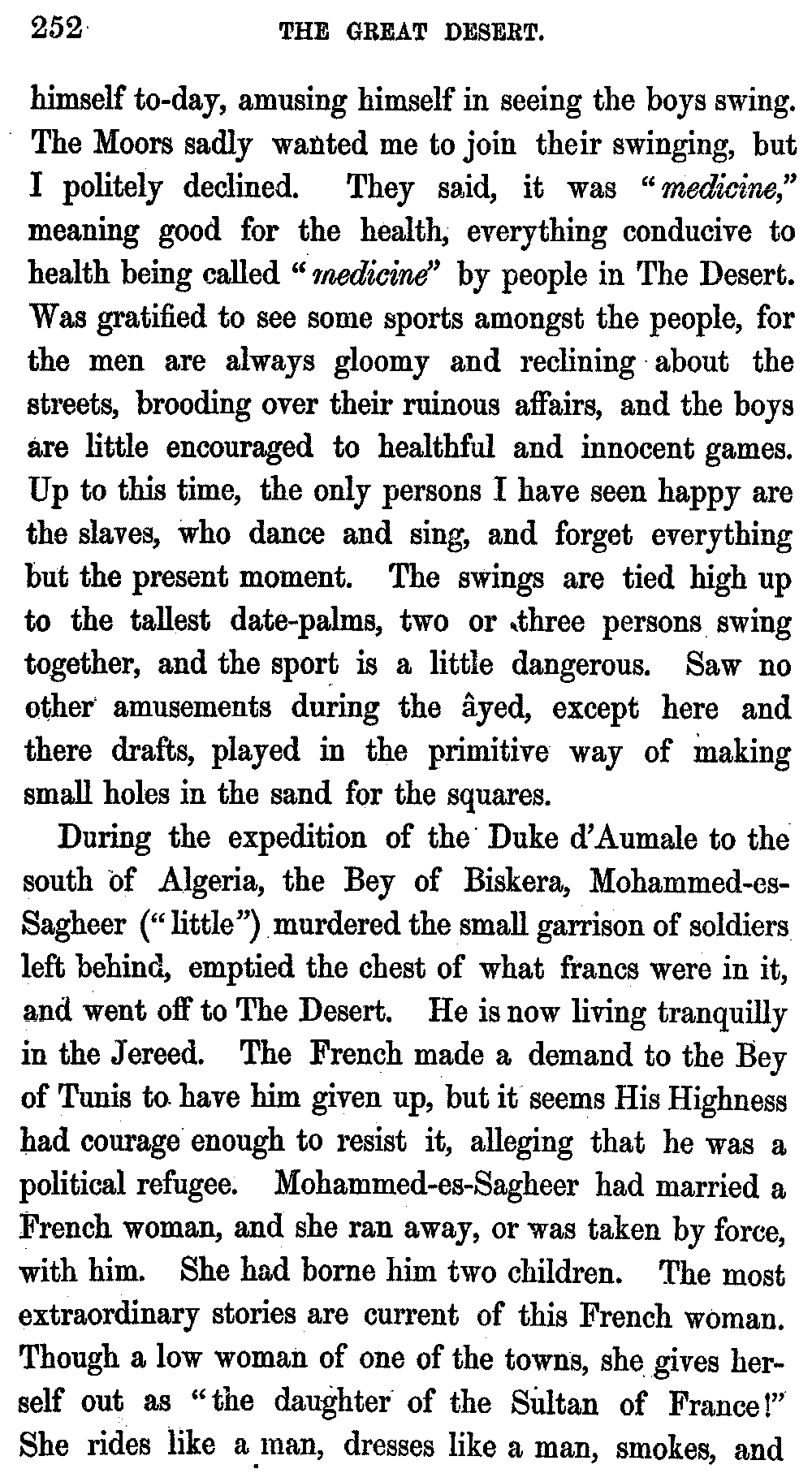 On the 9th we took in a little water from the well of Namwah. Several sea-gulls were here flying about. To-day I have to mention a fact which shows to what extraordinary changes of temperature the Great Desert is subject, as well as Barbary generally. About nine in the morning a strong ghiblee got up, increasing till it became so violent that we encamped at once, not venturing to expose the slaves to this killing simoum. Covering up my face and mouth, I put my head into a pannier. I was almost suffocated it is true, still it was better than exposing myself to the searching flame of this furnace wind. What became of the slaves I cannot tell, I was too busy with myself. Here I lay gasping for an hour, when Said came and called to me, "Now Bahree (‮بحري‬)," or north. "How, bahree!" I answered astonished. "Bahree! bahree!" he continued, "the caravan is going." I got up, and felt sensibly and convincingly enough it was bahree. The wind had made a whirlwind sweep in the space of an hour, it was now blowing as hard from the north as it had done from the south. But strange yet natural enough, columns of hot air were blown back into our faces from the north for some time, until, towards the evening, the wind became as cold, bleak, and biting, as it had been hot and stifling. These sudden changes are terrific, and are often attended with most serious consequences in The Desert. Asking our people how long a simoum or ghiblee would blow in The Desert,[457] they replied, "Never violently more than a couple of days." I do not recollect it once to have continued a whole day, but light south winds have prevailed for several days. As an instance of the calamitous effects of sudden changes of weather in North Africa, I may mention that, in the Spring of 1845, when Sidi Mohammed, "Bey of the Camp" in the Regency of Tunis, was returning from the Jereed, he lost, on one day, some Turks and other troops from the heat, and, on the very next day, several perished from the cold. Some hundred camels also died from the cold at the same time. A recent expedition in Algeria, during which some hundred French troops were frozen to death, must recur to the recollection of the reader, having happened from the same cause of a sudden change of temperature.