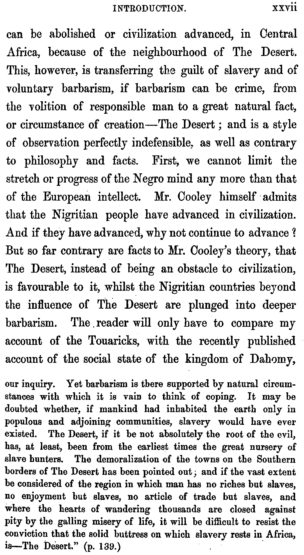 8th.—Slaves are the grand staple commerce of the Soudan and Bornou caravans, and without slaves this commerce could hardly exist. Twenty years ago, the Sheikh of Bornou reiterated to our countrymen; "You say that we are all the sons of one father; you say also, that the sons of Adam should not sell one another; and you know every thing. God has given you great talents. What are we to do? The Arabs who come here will[479] have nothing else but slaves. Why do you not send us merchants?"