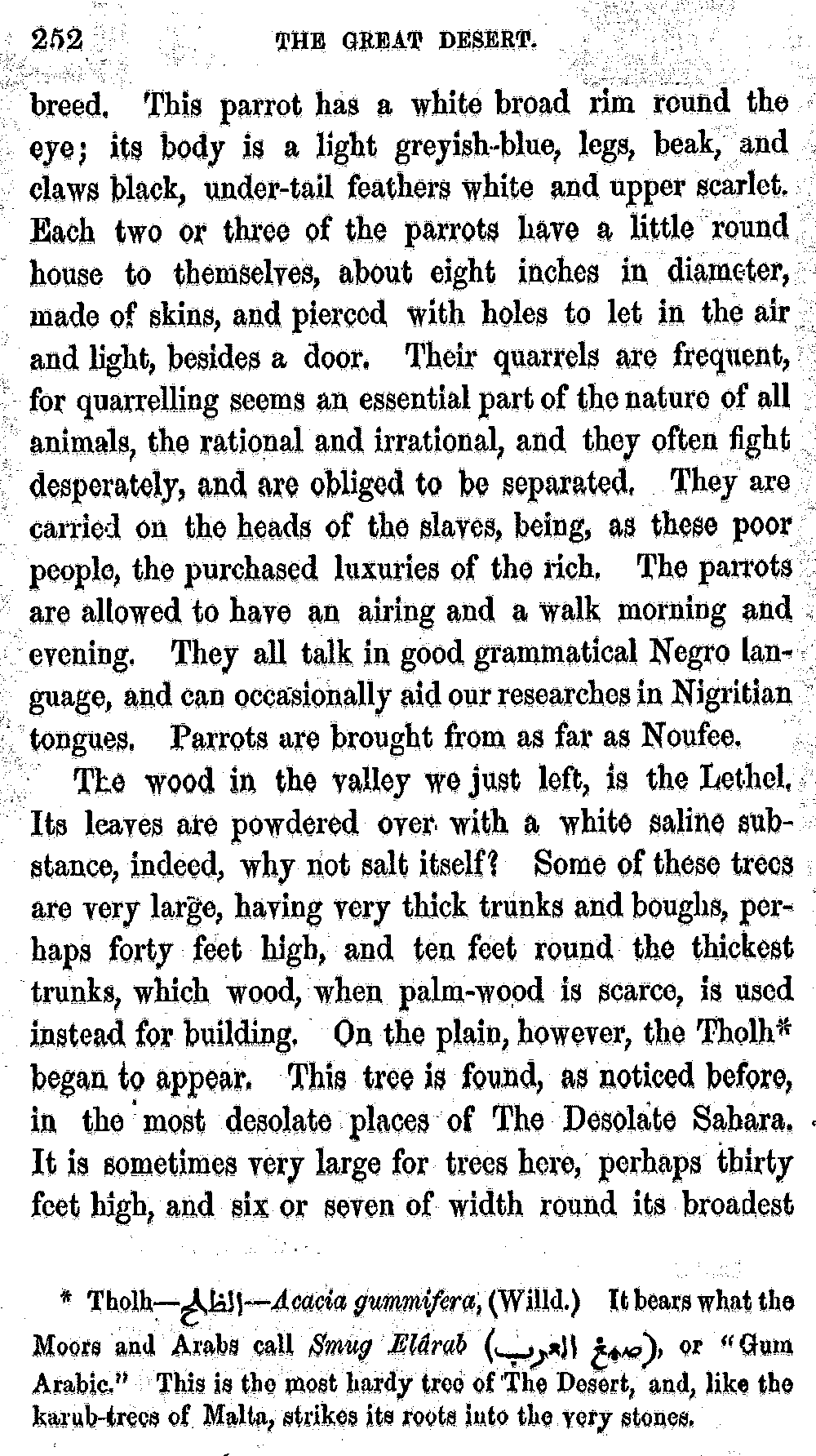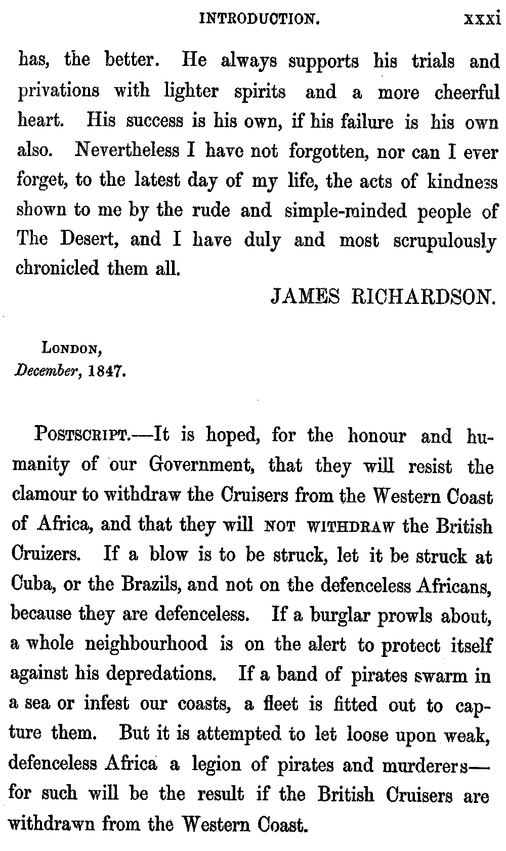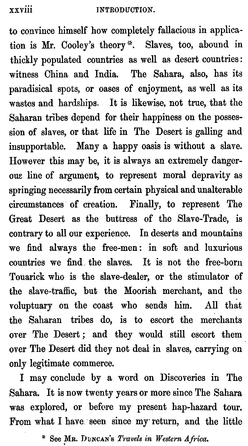 We sat down under some olives a minute, ate a few dates, drank a little water, and then entered the gardens of Tajourah, which offered nothing new, except that they were more richly cultivated than most of those we had seen on our way. Threading our way amidst the mud garden walls, I was gratefully soothed with the sight of increasing culture, and population. A sweet trait of the tender passion must be here recorded as taking place amidst this havoc of human cruelty, perpetrated on our sable brothers and sisters. At the side of my camel were two young things, a lad and a girl, who every now and then, when the Moors turned their heads, watching their opportunity, kept locking one another's fingers together. The lad now started off as if shot from a bow, and instantly brought some beans from a neighbouring garden, and these he presented gracefully to his lady-love. With such a little innocent incident, and there were many of the kind, I bid an eternal farewell to this slave caravan, by stating succinctly the results of my observations on the traffic in slaves, as carried on in The Great Desert of Sahara.