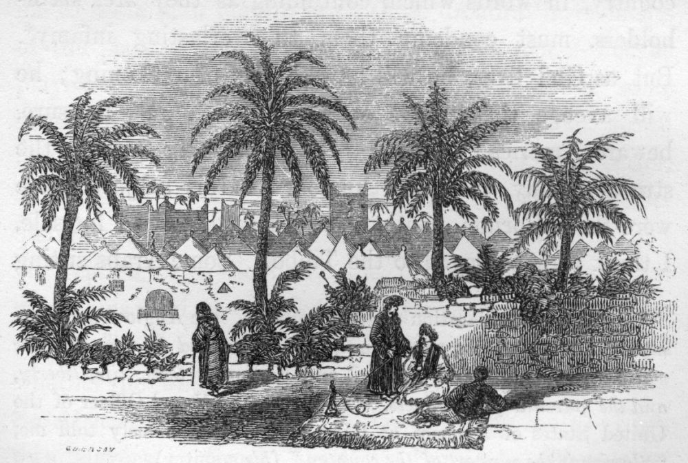 The gardens of Tajourah are about one and a half hours' ride. There was then the break of an hour, where are pools of stagnant salt-water, with snipes running about. Afterwards we entered the gardens of the Masheeah, amongst which is the British garden, or residence of Colonel Warrington. The Masheeah is a series of mud-walled gardens, or small fields of corn, fruit, and vegetable cultivation, and houses within the enclosures. Some of them not unlike town farms. The whole stretches some ten miles along the sea-shore. The population of the Masheeah, including Tajourah, is equal to that of the city of Tripoli itself, if not greater. These suburban villages have their mosques and religious establishments. They have besides a separate Governor from that of the town, and their inhabitants exercise great political influence during a revolution. In the last, these people supported one Bashaw, or pretender against the other, or that of the city. The Masheeah is two-thirds of a mile from the gates of Tripoli. The houses and gardens being situate mostly on the east and southeastern suburbs of the city.