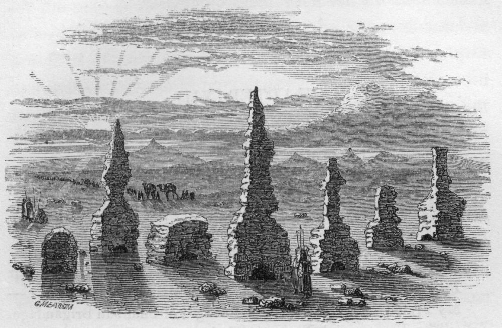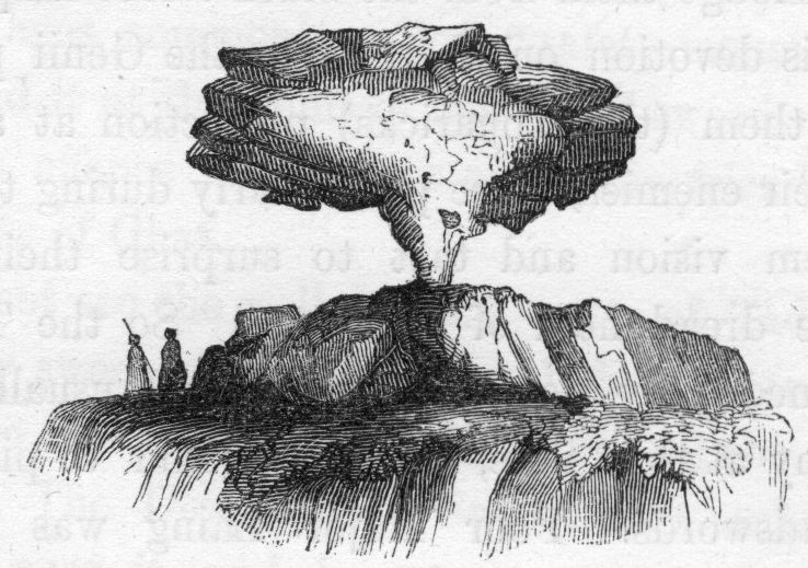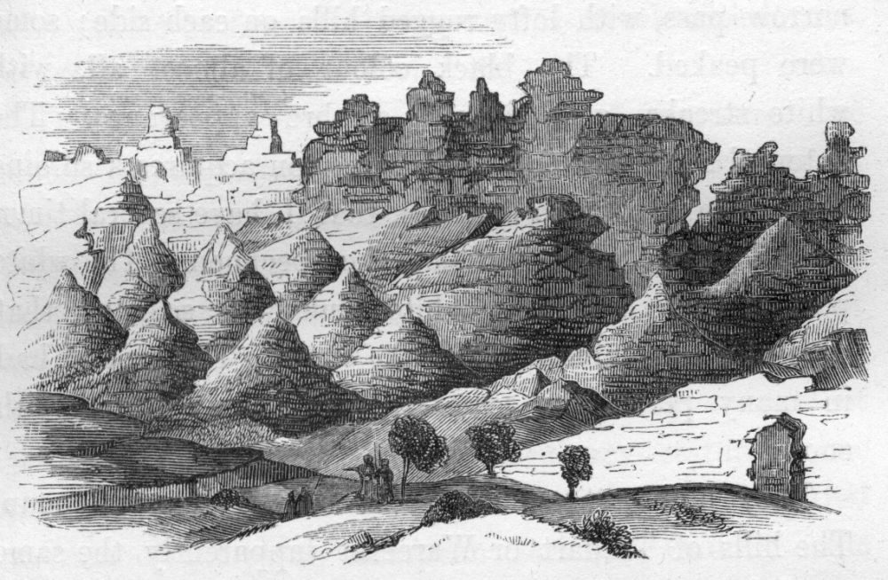On the evening of the 6th, we passed the spot where Abd-El-Geleel was decapitated, called Bughalah ("mule"). This was a small piece of mountain, looking abruptly over a wady, or deep valley. On this mountain block the Sheikh concentrated all his military forces, collecting as well the families of his tribe. Here he skirmished with the Turks for many days, he winning and they winning a battle, as it happened; but they, at length hemming him round, and isolating him on the rock, where there was not a drop of water to be had, the Sheikh finally was obliged to surrender. His retiring to this hideous rock was only matched in folly by his confiding in the faith of a Turk. Truly, when men are to be destroyed, their evil genius inspires them with madness.