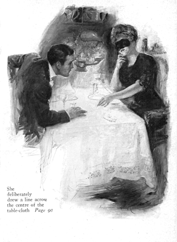 She faced him with an enigmatical smile, lighted a match, blew it out, and drew a line across the center of the table.