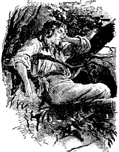 Robinson then proceeded to load the gun. He put in some powder, a ball of lead or bullet. Then at the hammer he placed a little cap which gave a flash when struck. This ignited the powder. When all was in readiness Robinson bade Friday follow him. They went slowly out into the forest along the stream. Soon Robinson espied a rabbit s[Pg 154]itting under a clump of grass. Robinson raised his gun, took careful aim, pressed the trigger. There was a flash and loud report and there lay the rabbit dead. But Friday, too, was lying on the ground. He had fainted from astonishment and fright. Robinson dropped his gun and raised the poor fellow up to a sitting position. He quickly recovered. He ran to get the rabbit. He examined it carefully. Robinson at last pointed out the hole the bullet had made and the mystery of the way the rabbit was killed was solved.
