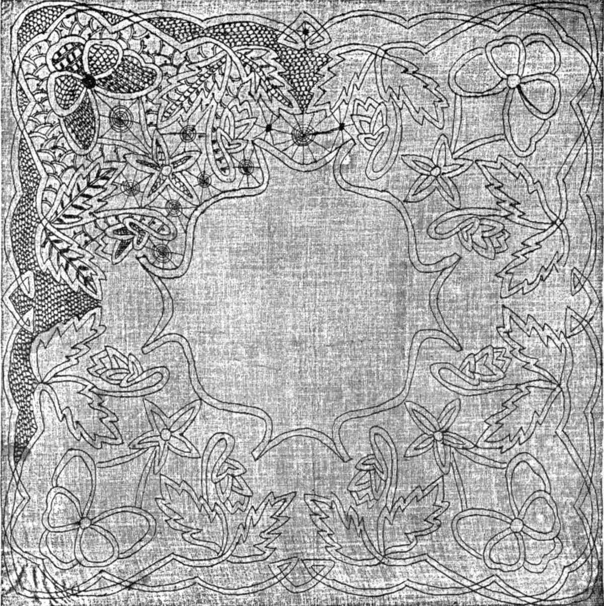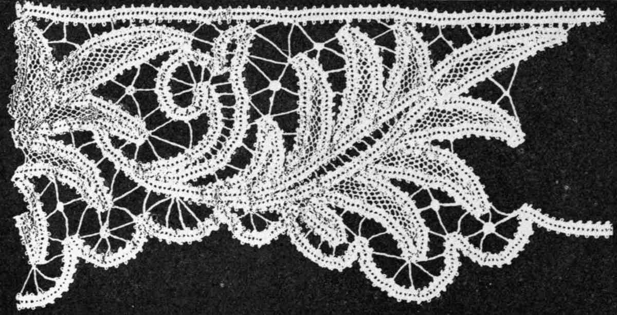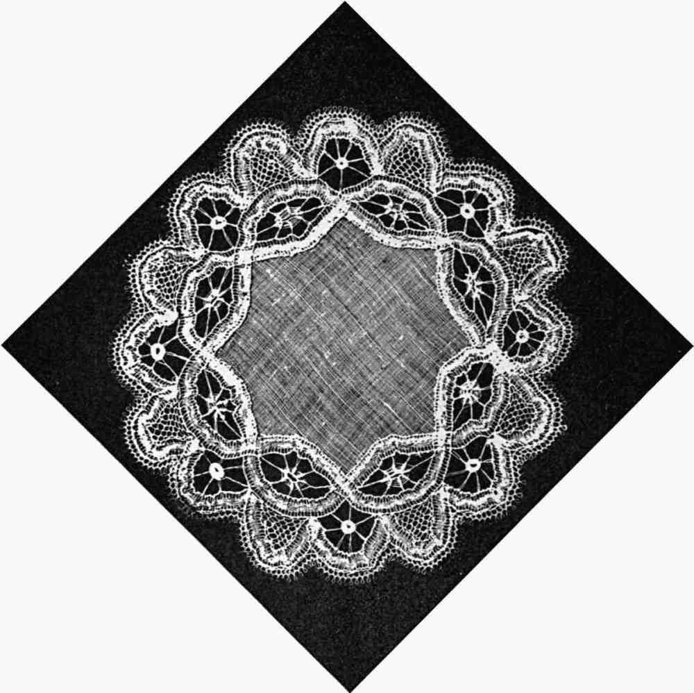 Lace-making establishments will furnish designs of any width or shape desired, and will also originate designs for special articles for which there are only occasional calls. Regular edging designs are ordinarily made in four widths—from quite narrow to very wide; and not infrequently a handkerchief design is enlarged sufficiently to form a square for a table or a fancy stand.
