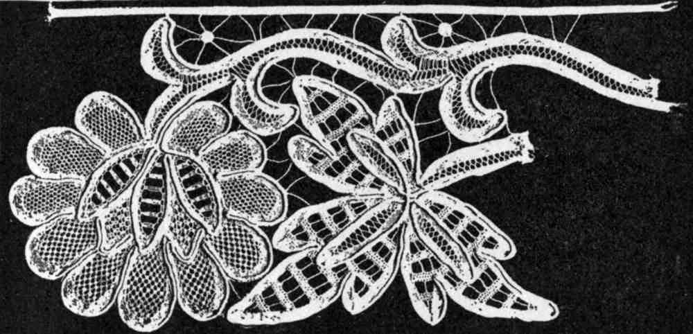 For each kind of lace there is a special sort of braid in various patterns, and the selection of the thread depends entirely upon the variety and quality of lace to be made. This selection should be left to the decision of the teacher or the skilled maker of laces, as she knows from experience the proper combinations of materials. Thus, in making Honiton and point lace, thread in twelve different degrees of fineness is used; and as the braids also vary in size, the thread must always be adapted to the braid. For Battenburg lace the thread is in eight sizes, the finest being used only for "whipping curves" or drawing edges into the outlines required. The "Ideal Honiton" is a new lace made with fancy Honiton braid and wash-silk floss in dainty colors, and is exquisite for doilies, mats, table scarfs and center-pieces.