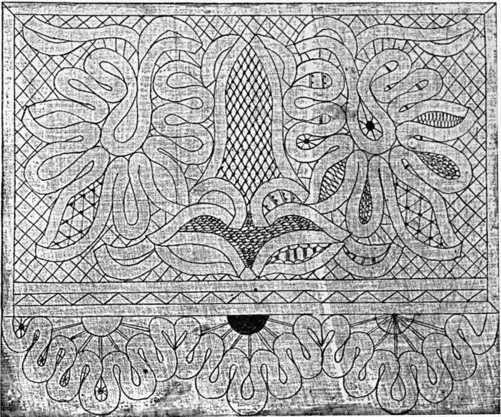 Up to the Sixteenth Century, however, open work embroidery was the favorite decoration, and from it the tangible origin of lace seems derived. During the Renaissance period the first book of embroidery patterns and lace-work appeared. The earliest volume bearing a date was printed at Cologne in 1527; and it was during the reign of Richard III. of England that the word lace was first used in the descriptions of the royal wardrobe.