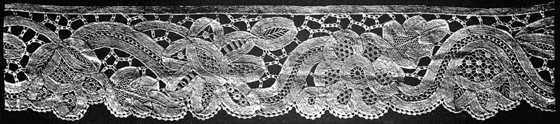 This lace, like any of the varieties now fashionable may be made wide or narrow, or fine or coarse by designs furnished as required by lace-makers in general; and the patterns may also be developed in silk or ribbon needle-point, which is a style of ornamentation appearing extensively as a decoration for scarfs, piano and table covers, mantel valences, etc., etc.[Pg 83]
