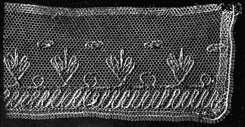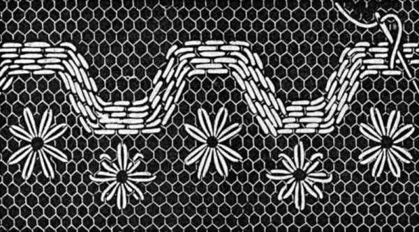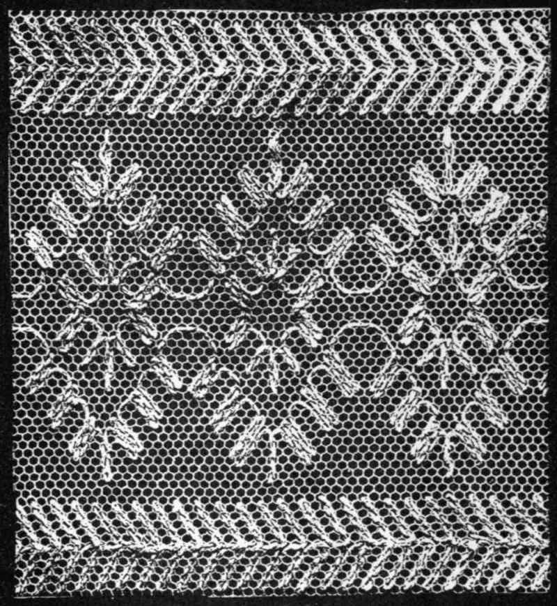 In making darned edgings, net may be purchased in various edging widths, and in this style is often called "footing." When bobbin net (or bobbinet as it is now called) was first invented, it was made only one inch wide but now it may be purchased three and one-half yards wide if desired.[Pg 107]