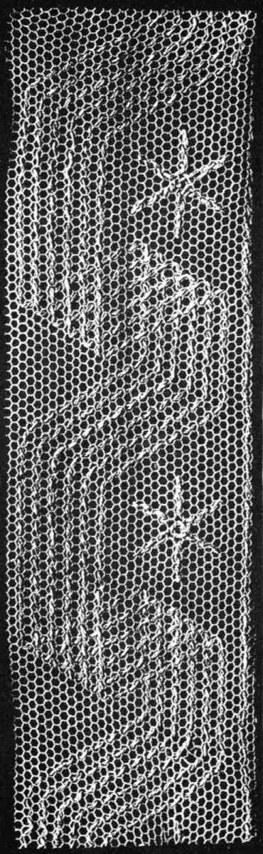 A tie-end in its actual width is here illustrated. The tie is about three-quarters of a yard long, and is darned in all-over style in the design seen in the engraving, with linen floss. A line of fine feather-edge braid finishes the tie in a dainty manner. This design may be used for any other article preferred, and its details will also suggest other designs of a similar character which may be invented by the worker. This scarf as well as the others just described, may be made up in black if preferred; and in this event it will be easier for the darner to follow the meshes if she bastes her net over a white background. The design may or not be traced on this background.[Pg 103]