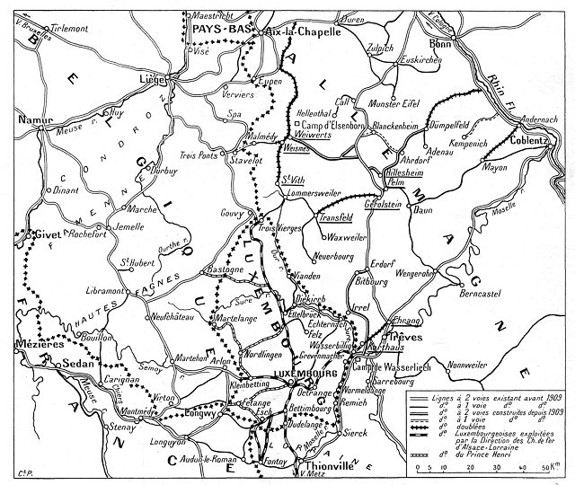 L'invasion du Luxembourg par les armées allemandes était, depuis longtemps, une éventualité prévue par notre état-major. Il suffit, en effet, de regarder une carte pour voir qu'entre la ligne des Vosges et la Belgique, le Grand-Duché de Luxembourg, petit territoire de 2.500 kilomètres carrés, constitue une voie d'accès en France tout indiquée pour une armée venant de la Prusse rhénane. Aussi, depuis longtemps, le gouvernement allemand, chargé de l'exploitation des chemins de fer du Luxembourg, avait mis à profit cette situation privilégiée pour organiser en vue de sa mobilisation le réseau du Grand-Duché. Notre carte indique l'importance des travaux accomplis dans ce but.
