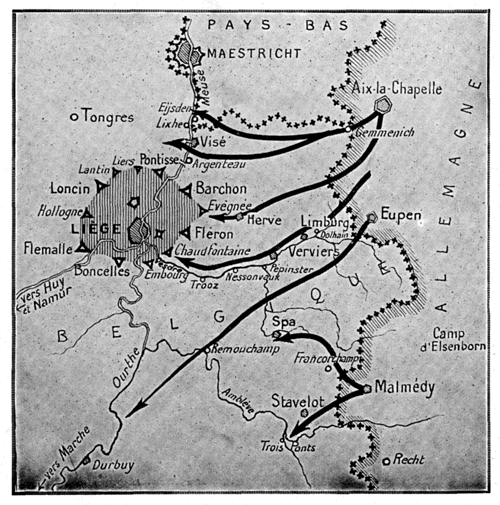 L'état-major allemand avait d'ailleurs tout préparé pour attaquer dans ces conditions. Il avait raccordé étroitement le réseau ferré de l'Allemagne à celui de l'Etat belge; tout près de la frontière, à Malmédy, il avait créé le camp retranché d'Elsenborn, dont l'approche était gardée avec une sévérité extraordinaire.
