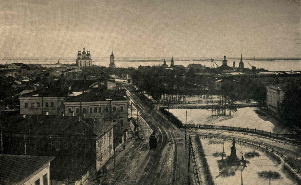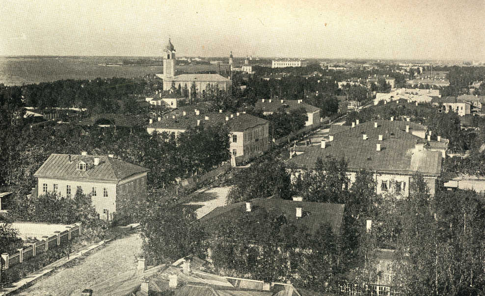 So we sped up into the White Sea and into the winding channels of the broad Dvina. For miles and miles we passed along the shores dotted with fishing villages and with great lumber camps. The distant domes of the cathedrals in Archangel came nearer and nearer. At last the water front of that great lumber port of old Peter the Great lay before us strange and picturesque. We dropped anchor at 10:00 a. m. on the fourth day of September, 1918. The anchor chains ran out with a cautious rattle. We swung on the swift current of the Dvina, studied the shoreline and the skyline of the city of Archangel, saw the Allied cruisers, bulldogs of the sea, and turned our eyes southward toward the boundless pine forest where our American and Allied forces were somewhere beset by the Bolsheviki, or we turned our eyes northward and westward whence we had come and wondered what the folks back home would say to hear of our fighting in North Russia.