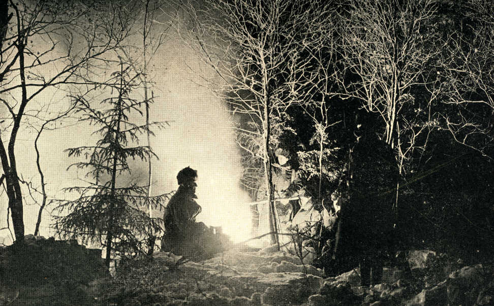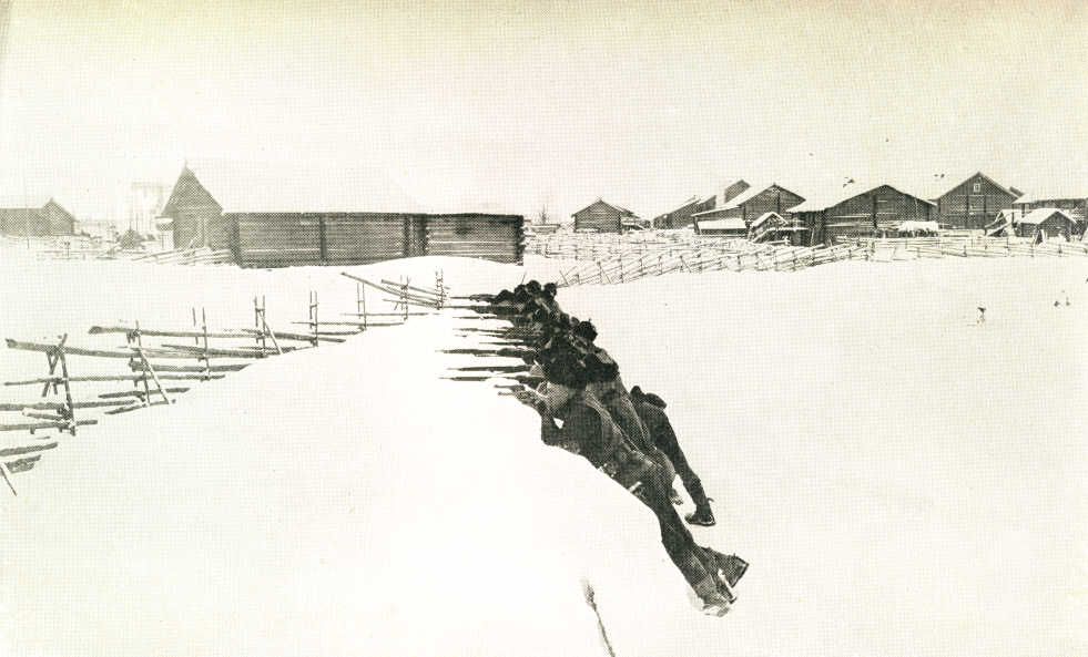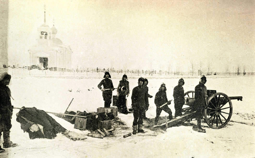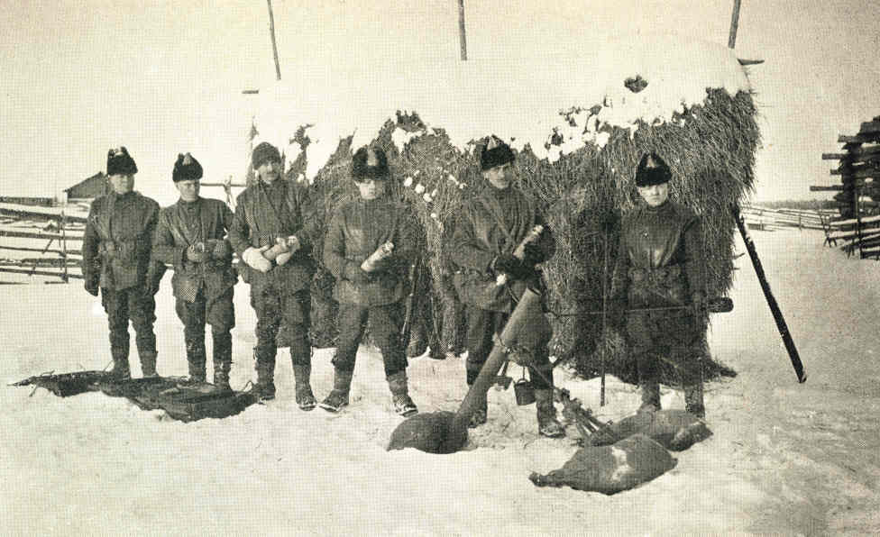 In the spring the great ice crunching up in the rivers and the sea was to behold those same veteran Yanks still fighting the Red Guard armies and doing their bit to keep the state of Archangel, the North Russian Republic, safe, and their own skins whole. The warming sun and bursting green were to see the olive-drab uniform, tattered and torn as it was, covering a wearied and hungry and homesick but nevertheless fearless and valiant American soldier. With deadly effect they were to meet the onrushing swarms of Bolos on all fronts and slaughter them on their wire with rifle and machine gun fire and smash up their reserves with artillery fire. With desperation they were to dispute the overwhelming columns of infantry who were hurled by no less a renowned old Russian General than Kuropatkin, and at Malo Bereznik and Bolsheozerki, in particular, to send them reeling back in bloody disaster. They were to fight the Bolshevik to a standstill so that they could make their guarded getaway.