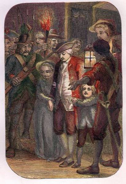 The family had but a short way to go; and their passage to the Assembly was watched from the windows by some of the doomed friends whom they left behind. They walked between two rows of guards; but were yet so pressed upon that the queen was robbed of her watch and purse. Louis held his mother’s hand, and amused himself with kicking the dead leaves as he walked. A gigantic man, a ringleader of the mob, snatched up the boy, and carried him. The queen screamed with terror, and was near fainting: but the man said, “Do not be frightened: I will do him no harm.” He merely carried him, and then set him down at the gate, where a deputation from the Assembly came out, to meet the royal family. From the palace windows the royal family were seen to enter that gate; and those who saw it well knew that all hope for the royal cause was now over.