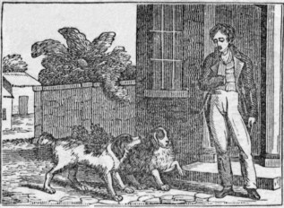 Those dogs both live in one house, and have the same master, who is very fond of them, and has trained them to work together; and, when one is sent on an errand, the other always goes too. They are now standing at the door of the school-room, waiting for their master’s children to come out. Jane and Ellen are very young, and would not know how to go and come, without the company of the dogs. They love Carlo and Shag, and are never afraid when they are with them. You see the teacher standing at the door; he wants to know the errand of the dogs. How earnestly they look up at him, as if telling him what they have come for; and Shag has lifted his foot to step on the door-stone. They start off for school so regularly, every day, that it is quite surprising.