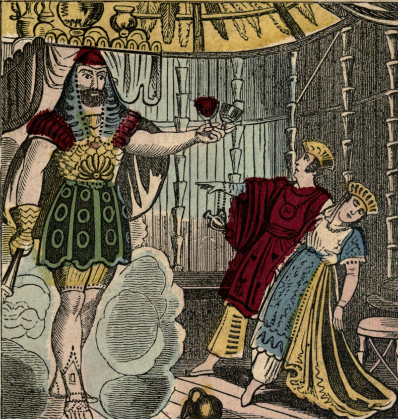 And cups, with wine of rosy hue.