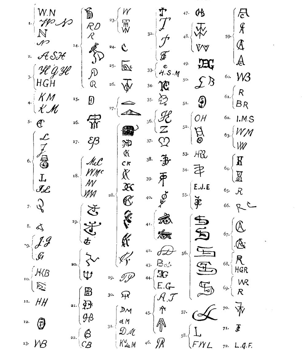 [7] The initials and monograms appear in the following order round the Table: 1, Mark Lemon; 2, F. C. Burnand (second carving, after stencil by Prof. Herkomer, R.A.); 3, John Tenniel; 4, Shirley Brooks; 5, Arthur à Beckett; 6, R. C. Lehmann; 7, W. M. Thackeray; 8, Henry Silver; 9, Harry Furniss; 10, John Leech; 11, G. du Maurier; 12, W. Bradbury; 13, Douglas Jerrold; 14, E. J. Milliken; 15, F. M. Evans; 16, Tom Taylor; 17, Linley Sambourne; 18, Phil May; 19, J. Bernard Partridge; 20, E. T. Reed; 21, H. W. Lucy; 22, F. C. Burnand (first carving); 23, Gilbert à Beckett; 24, Anstey Guthrie; 25, Horace Mayhew; 26, Percival Leigh. Charles H. Bennett died before he could complete his monogram, and Mr. R. F. Sketchley neglected the duty—an omission he ever after regretted.