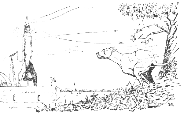 Something came twisting forward to hit the doorframe, it dropped just inside the doorjamb. Buregarde leaped, snapped at the thing and caught it in midair, snapped his head in a vicious shake and sent it whirling back outside again before it could be identified. The dog sunfished and landed on all four. Then the thing went off with a dull pouf! outside. There was a gentle flash of quick light that was smothered by a billow of smoke. Buregarde leaped into the cloud and disappeared. There was a hoarse shriek and the mad scrabble of dog-claws on the hard floor, the sound of a heavy thud, and the angry snarl of a dog with its teeth fastened into something soft. Then there was the fast patter of dog-feet and Buregarde came around the door on a dead run, sliding side-wise to carom off the opened door into safety just as a pencil-ray flicked to follow him.