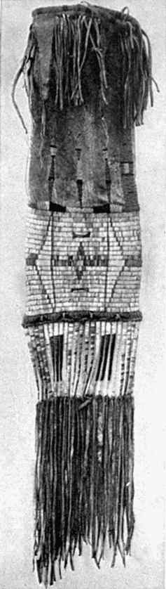 The purely decorative ability which lived and flourished before the advent of civilization lost its distinctive simplicity of character when woven [13] cloth of brilliant red flannel and the tempting glamour of colored glass beads came into their horizon, although they accepted these new materials with avidity. Porcupine quill work seems to have been no longer practiced, although a few headbands of ceremony are to be found among the tribes, and now and then one comes across a veritable treasure, an evidence of long and unremitting toil, which has been preserved with veneration.