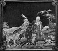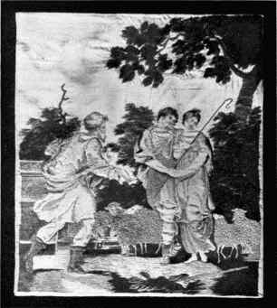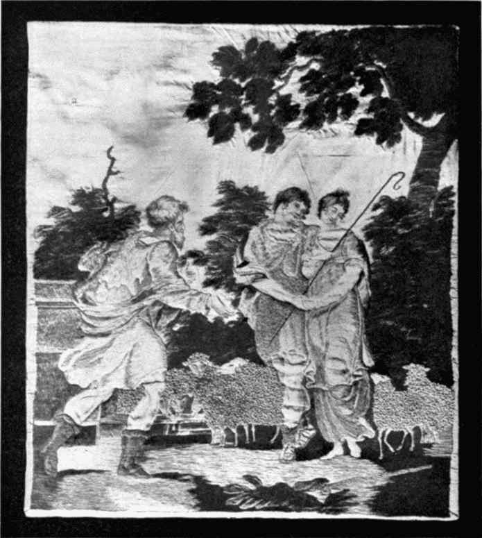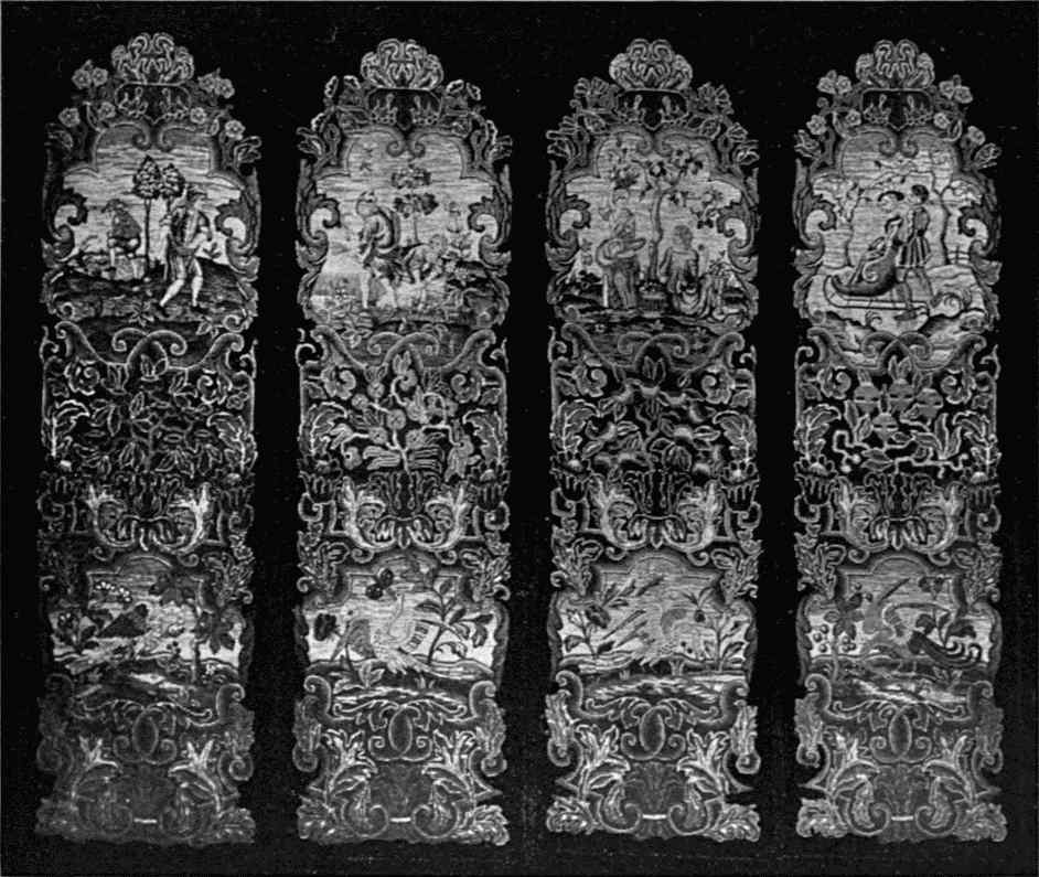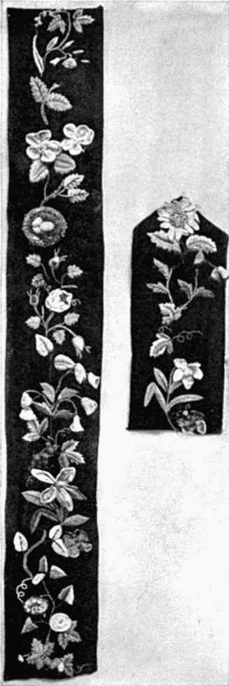 Embroidery became once more the most facile and successful of pursuits. Graduates from the Kensington School were employed as teachers in nearly all of the different societies, and in this way every city became the center of this new-old form of embroidery, for what is called "Kensington Embroidery" is in fact a far-away repetition of old triumphs of the British needle. I use the word "British" advisedly, for it was when England was known as Britain among the nations that her embroidery was a thing of almost priceless value. In modern English embroidery, the days of Queen Anne have been the limit of backward imitation; and, in fact, ancient English embroidery was a process of long and assiduous labor, as well as of knowledge and inspiration. Our hurried modern conditions would not encourage the repetition of the hand-breadth pictures in embroidery of the earliest specimens, where countless numbers of stitches were lavished upon a single production. The embroidered picture of The Garden of Eden described in chapter four is a specimen of the minute representation. These specimens are, to [111] the art of needlework, what the Dutch school of painting is to the great mural canvases of the present day.