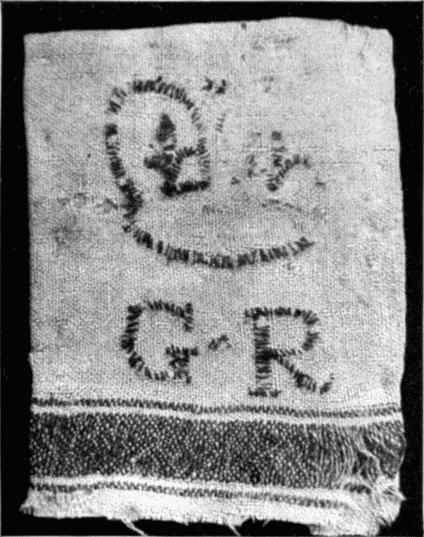 HOMESPUN WOOLEN BLANKET with King George's Crown embroidered with home-dyed blue yarn in the corner. From the Burdette home at Fort Lee, N. J., where Washington was entertained.