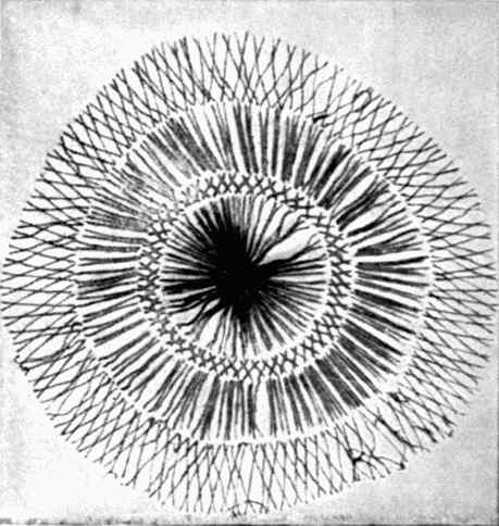 Many of the designs which decorate the larger pieces, like shirts and blankets, were evidently so inspired. The designs of lengthened and unequal zigzags are lightning flashes translated into embroidery; the lateral lines of broken direction are water waves moving in masses. There are clouds and stars and moons to be found among them, and if we could interpret them we might even find records of the sensations with which they were regarded.