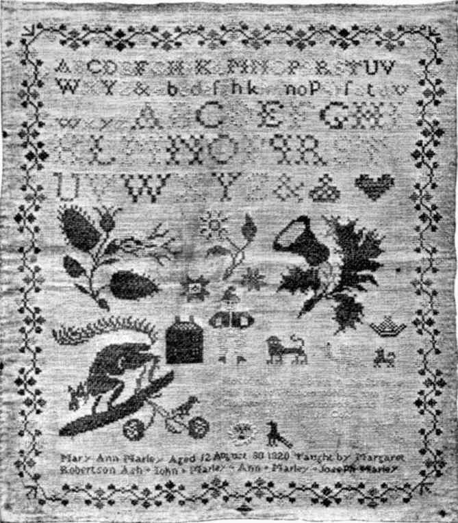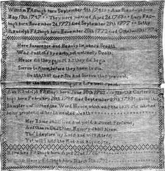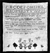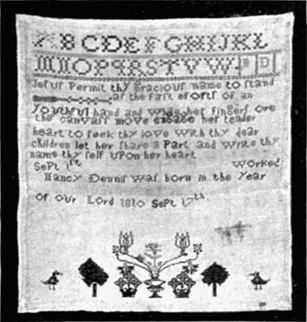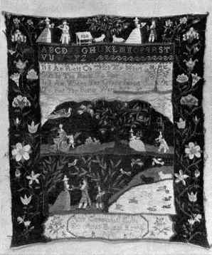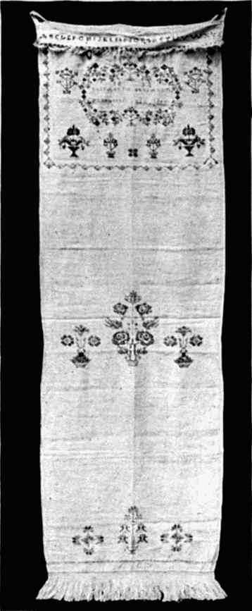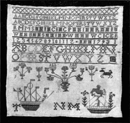 While the Puritan mother was scheming to add embroidery to her occupations, she did not forget to train each small maid of the family to the use of the needle. Ruth and Peace and Harmony and Mercy made their samplers as faithfully as though they were growing up under the shade of the apple trees of old England [20] instead of among the blackened stumps of newly cut forests.