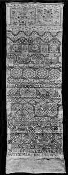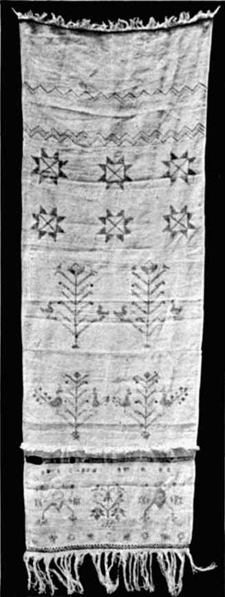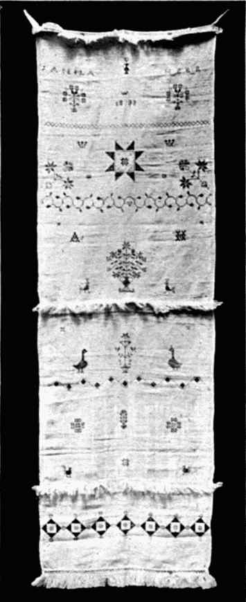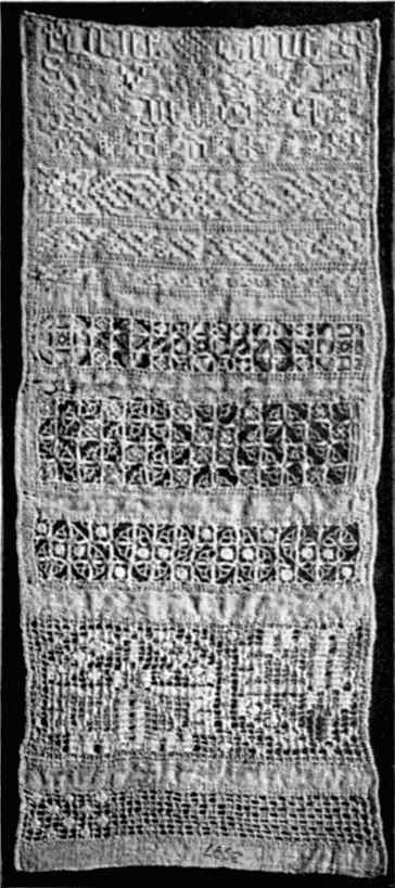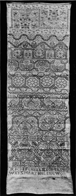 It is interesting to note that it had no place in aboriginal embroidery, and marks its creation as following the art of weaving. It is a long step from this traditional past of its origin to the short past of the stitchery of America, where the little fingers of small Puritan maids followed the lines evolved by the generations of the earlier world.