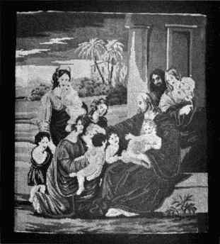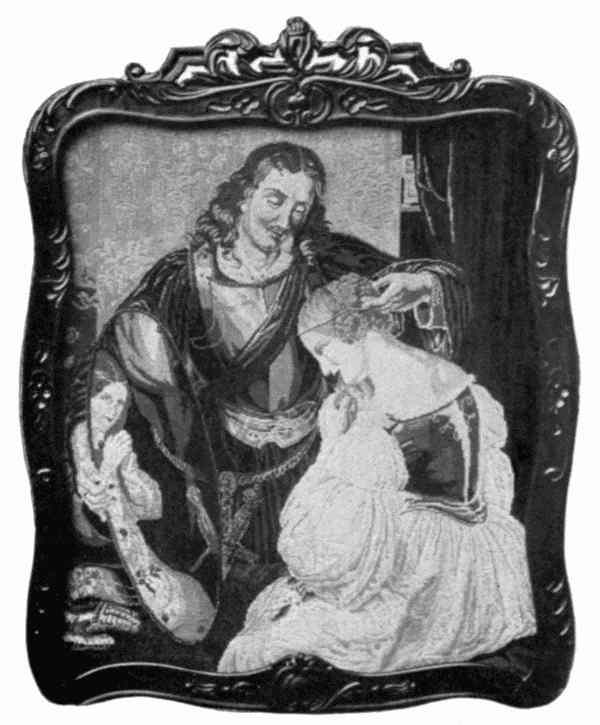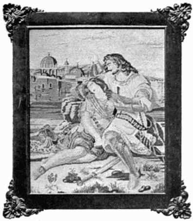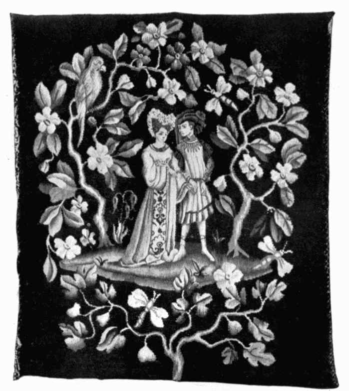 Yet we must acknowledge there are many examples of Berlin woolwork which possess the merits of beautiful color and exact and even workmanship. Some of them are done upon the finest of canvas with silks of exquisite shadings, and where figures are represented the faces are [99] worked with silk in "single stitch," which means one crossing of the canvas instead of two, as in ordinary cross-stitch. The latter was of course better suited for furniture coverings, both in strength and quality of surface, while the method of single stitch succeeded in presenting a smooth and well-shaded surface, sufficiently like a painted one to stand for a picture. Indeed, veritable pictures were produced in this method and were effective and interesting. In these specimens the faces and hands, while worked in the same cross-stitch, were varied by being done on a single crossing of the canvas with one stitch, while the costumes and accessories of the picture were done over the larger square of two threads of the canvas, with the double crossing of the stitch.