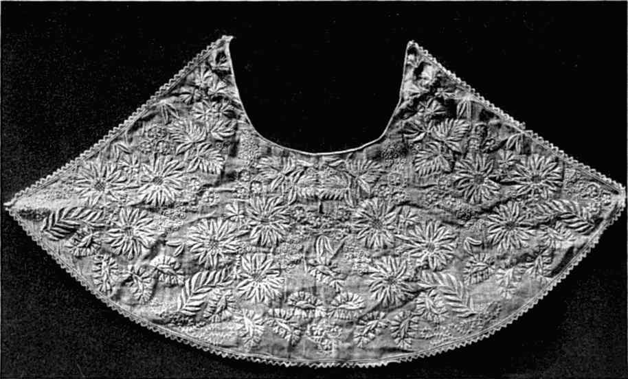The history of embroidery in America would naturally begin with the advent of the Pilgrim Mothers, if one ignored the work of native Indians. This, however, would be unfair to a primitive art, which accomplished, with perfect appropriateness to use and remarkable adaptation of circumstance and material, the ornamentation of personal apparel.