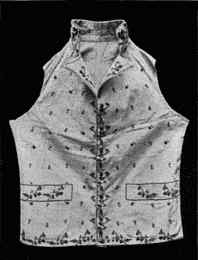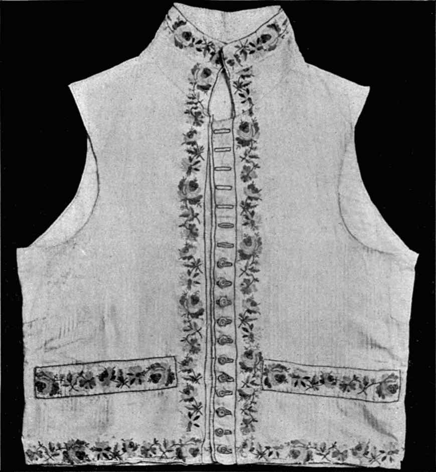 Right—WHITE COTTON VEST embroidered in colors. Eighteenth-nineteenth century American.