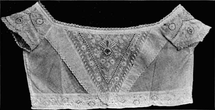It is curious to contrast the effect of this loss of [105] embroidery in the two countries, England and America. Doubtless there were other reasons than the lost popularity of needlework as an art, that in England it should have resulted in the life or death practice of necessary needlework, and in America, that the facile fingers of woman simply turned to the ivory keys of the piano for occupation. But the fact remains that starvation threatened the woman of one country, while in the other they were practicing scales. In England it was a period of stress and strain, of veritable "work for a living," the period of "The Song of the Shirt." Happily, in this blessed land, where hunger was unknown, we were not conscious of its terrors, and perhaps hardly knew why the "cambric needle" and the darning needle were the only ones in the market. Embroidery needles had "gone out." Then came the relief of the sewing machine, born in America, where it was scarcely needed, but speedily flying across the ocean to its life-saving work in England, where the tragedy of the poor seamstress was on the stage of life. Like many another form of relief, it was not entirely adequate to the situation. Its first effect was to create a need of remunerative [106] work. The sewing machine took upon itself the toil of the seamstress, but it left the seamstress idle and hungry. This was a new and even darker situation than the last, but Englishwomen came to the rescue with a resuscitated form of needlework and embroidery tiptoed upon the empty stage, new garments covering her ancient form, and was welcomed with universal acclaim.