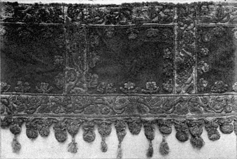 The embroidered chair and sofa covers had quite the effect of tapestries, and were far better than a not uncommon variation of the same needlework, where the broadcloth or velvet background held the embroidery.