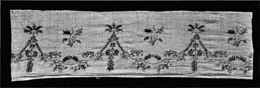 But as we do not make the early art of long existent races models upon which to shape our search for the most beautiful, the persistence of Eastern form in embroidery need not prevent our progress in design. I made an interesting note of this persistence of Eastern design, when, many years ago, I had an opportunity of examining some mummy wrappings from a burial ground at [142] Lima, Peru. They were wonderful weavings of aboriginal cloth, bordered with embroidery done in dyed or colored threads of flax, in designs as purely Eastern as can be found in any ancient or modern Eastern embroidery. How could it happen that the ornamental designs of the Far East and the Far West should touch each other? Was it similarity of thought knowledge, the kinship of the human mind, or some long-forgotten means of transmission of the material and actual, of which we all-knowing moderns do not even dream? This wonderful South American embroidery of past ages antedated many antique remains of the art of stitchery which we treasure with as wide a margin of time as lies between their day and ours.
