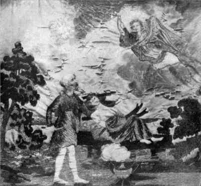 It was interesting to find the perforations along the lines of the composition still showing in the photographed cartoon, and we made use of them by going over them with pin pricks, fastening the cartoon over the sheet of silk canvas woven for the background, so that there was no possibility of shifting. Prepared powder was sifted through the lines of perforation and fixed by the application of heat, and we then had the entire composition exactly outlined upon the ground. After that the work of superimposing color and shading by needle weaving was a labor of love and diligent fingers during many months. Every inch of stitchery was carefully criticized [135] and constantly compared with the colored copy, and at last it was a finished tapestry and was hung in a north light on one of the great spaces of the studio, where it was an object of expert examination and general admiration.