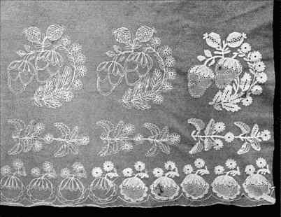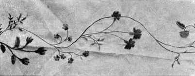 As a natural result, crewels were soon discarded in favor of silks, and natural extravagance, or national influence, led to the use of costly materials instead of the linens of English choice and preference. So the old flower embroidery of Bethlehem had a second birth. American girl art-students soon found their opportunity in the creation of applied design, and before embroidery had ceased to be a matter of representation of [112] flowers in colored silks, the flowers grew into restrained and appropriate borders, or proper and correct space decoration, and the day of women designers for manufacturers had come.
