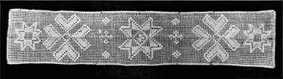 The mechanical and commercial effect of this stitchery discouraged its use; its printed patterns and the regularity of its counted stitches giving neither provocation nor scope to originality of thought or design. This was not the fault of the stitch itself, since "cross-stitch" was the first form of needle decoration. It is, in fact, the A B C of all decorative stitchery, the method evolved by all primitive races except the American Indian. It followed, more or less closely, the [101] development of the art of weaving. When this had passed from the weaving together of osiers into mats or baskets, and had reached the stage of the weaving of hair and vegetable fiber into cloth, the decoration of such cloth with independent colored fiber was the next step in the creation of values, and, naturally, the form of decorative stitches followed the lines of weaving. Simple as was its evolution, and its preliminary use, cross-stitch has a past which entitles it to reverence. With many races it has remained a habitual form of expression, and, as in Moorish and Algerian work, is carried to a refinement of beauty which would seem beyond so simple a method. It has given form to a lasting style of design, to geometrical borders, which have survived races and periods of history, and still remain an underlying part of the world of decorative linens.