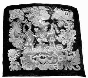 We soon came to the ideal of tapestries which loomed above and beyond us and had been reached by every nation in turn which had applied art to textiles, but in all except very early work the accomplishment had been more of the loom than of hand work. My dream was of American Tapestries, made by embroidery alone, carrying personal thought into method. We decided that there was no reason for the limitation of the beautiful art of needlework to personal use, or even to its numerous domestic purposes. This most intimate of the arts of decoration has been in the form of wall hangings for the bare wall spaces of architecture from the time when dwellings passed their first limited use of protection and defense. After this first use of houses came the instinct and longing for beauty, and the feeling which prompts us in these wider days of achievement to cover our wall spaces with [127] pictures, moved our far-off forefathers and mothers to offer their skill in spinning, and weaving, and picturing with the needle hangings to cover the bareness of the home. This impulse grew with the centuries, until tapestries were a natural art expression of different races of men, so that we have Italian, Spanish, French, Dutch and English tapestries, each with national tastes and characteristics of production. As time went on, inevitable machinery undertook the task of making wall hangings, with the whole-hearted help of all who had given their lives to art, and tapestries had become a part of the riches of the world. When the greater part of the world's wealth was in the possession of Popes and Princes, it was usual to expend a goodly portion of it in works of art. Pictures and tapestries and exquisitely wrought metal work, weavings and embroideries, made priceless by costly materials and the thoughts and labor of artists, were reckoned not as a sign of wealth but as actual wealth. They were really riches, as much as stocks and bonds are riches today. Such things were accumulated as anxiously and persistently as one accumulates land or houses, or railroad bonds or stocks, and [128] the buyer was not poorer; but in fact he was richer for money expended in this fashion. This everyday financial fact lay underneath and supported the beautiful pageant of the fifteenth and sixteenth centuries, gilding them with a radiance which has attracted the admiration and excited the wonder of all succeeding years.