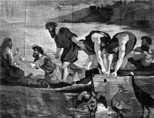 Being thus fully equipped for the production of real tapestries, well adapted to the processes of what I called "needle weaving," since the needle was really used as a shuttle to carry threads over and under the already fixed warp, the next decision rested upon the subject of this new application of the art and the knowledge we had gained by study and practice and love of textile art. With a courage which we now wonder at, we selected perhaps the most difficult, as it certainly is the most beautiful, of surviving tapestries, "The Miraculous Draught of Fishes," the cartoon of which, designed by Raphael, is at present to be seen and studied at the Kensington Museum in London. The decision to copy this was perhaps influenced by the fact that it was the only original cartoon of which I had knowledge, and my summer holiday in London was spent in its study, and schemes for its exact reproduction. As it was spread upon a wall in museum fashion, a drawing could not be actually verified by measurements, but an expedient came to me which proved to be satisfactory. I had [134] two photographs, as large as possible, made from the cartoon, and one of them, being very faintly printed, copied exactly in color; the other was ruled and cut into squares, and was again photographed and enlarged to a size which would bring them, when joined, to the same measurements as the original cartoon. These, very carefully put together, made a working drawing for my tapestry copy, and the lighter photograph, which had been most carefully water-colored, gave the color guide for the copy.