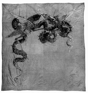 I had reason to think that the Exhibition made by the Associated Artists at Chicago was of lasting use to all lovers of needlework, the world over, since so many other races came there to get their world lessons. I learned much that was of value to me from familiar study of the exhibits from different countries, from their excellencies and differences and the reasons why such wide divergences existed, and from observation of the people themselves who produced them—for many of the exhibits were in charge of practical needleworkers who knew the history of their art from [141] its very beginning. I found more of interest in Oriental art from seeing that it was not merely a perfunctory repetition of stitches and patterns, but that there was a stanch, almost a religious, integrity in doing the thing exactly as it had been done by generations of forefathers, and that the silks and tissues and flosses and threads of gold were the best the world produced. In the presence of such fidelity, what mattered it that the borders and blocks were formed of angles, or zigzags, or squares, or any other fixed and mechanical shapes? The spirit of it was true to its race and traditions. In the face of it, all our beautiful copies of flowers, and growths, and gracious forms of nature seemed almost experimental—the art of growing and changing nations.