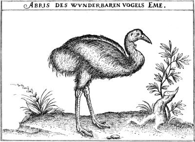 II. | Abris des wvnderbaren Vogels Eme. From the fifth edition of Erste Schiffart in die orientalische Indien so die holländische Schiff im Martio 1595 aussgefahren vnd im Augusto 1597 wiederkommen verzicht … Durch Levinvm Hvlsivm. Editio Quinta. Getruckt zu Franckfurt am Mäyn durch Hartmann Palthenium in Verlegung der Hulfischen. Anno M.DC.xxv., From a copy of the book in the British Museum. By permission of the Keeper of Printed Books. | p. 22 |
