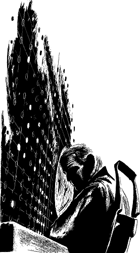 The splashes of light separated; one moved quickly off the screen, the other held stationary for several minutes, then contracted and began a steady, jagged advance toward the center of the grid. One inch down, half an inch over, two inches down, then four inches on a diagonal line.